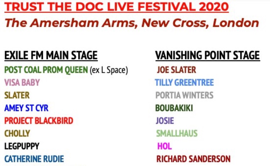 Our own Neil March is curating a Trust the Doc Festival on 4th April 2020 at the Amersham Arms in New Cross, London. We are honoured to be represented as a main stage alongside the Vanishing Point stage, and to be part of an event that features such exciting and innovative new music artists. Will Neil be broadcasting live on the day?! Watch this space....